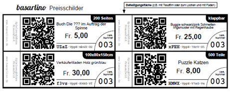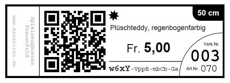 - Das Basarlino System erstellt von allen erfassten Artikeln automatisch Etiketten. Darauf befinden sich alle nötigen Angaben, sowie ein QR-Code für den Verkauf.